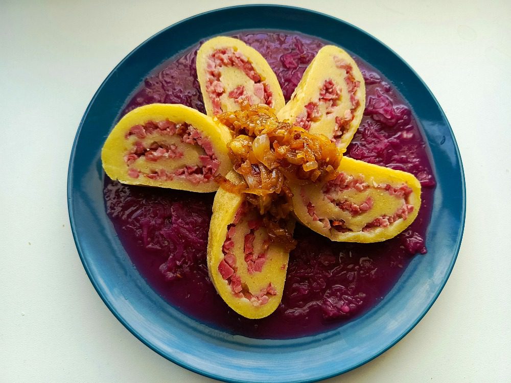 roláda z bramborového těsta s uzeným masem, červeným zelím a osmaženou cibulkou