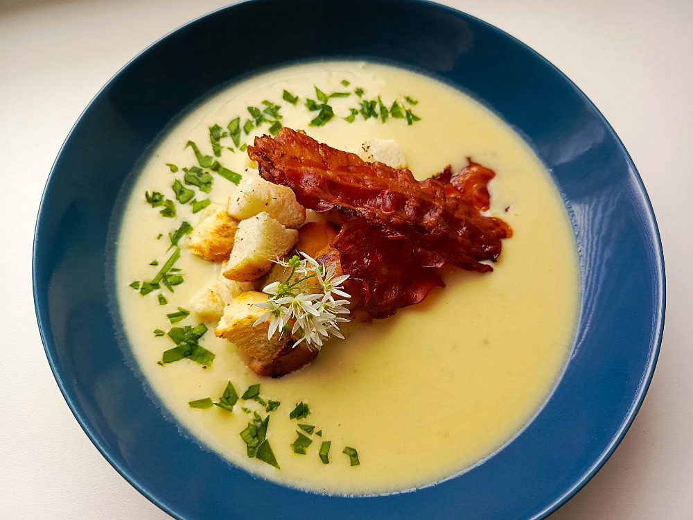 polévka z pečeného česneku s krutony, medvědím česnekem a slaninovým chipsem